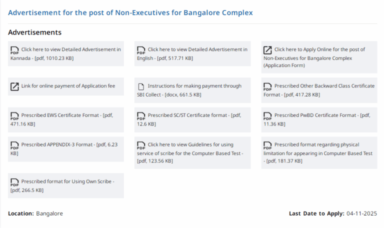 - होम पेज पर पहुंचने के बाद आपको Advertisement for the post of Non-Executives for Bangalore Complex के नीचे दिए गए Click here to Apply Online for the post of Non-Executives for Bangalore Complex (Application Form) के ऑप्शन पर क्लिक करना होगा।