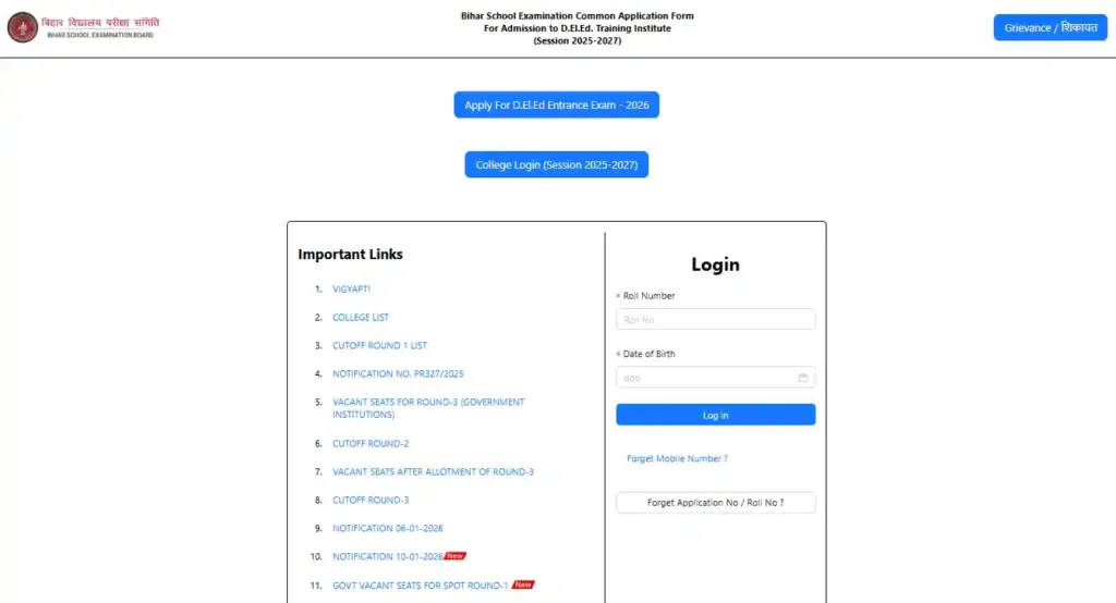 Bihar DElEd Spot Admission 2026 के लिए आप इसकी आधिकारिक वेबसाइट पर जाकर बहुत आसानी से ऑनलाइन आवेदन कर पाएंगे।