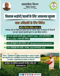 Bihar Dhan Adhiprapti 2024: इस अधिसूचना में यह भी स्पष्ट किया गया है कि धान की खरीद की कीमत क्या होगी, रैयत और गैर रैयत किसान किस प्रकार आवेदन कर सकते हैं, और इस योजना के अंतर्गत कितना धान बेचा जा सकता है। विस्तृत जानकारी के लिए आवेदन ऑनलाइन माध्यम से करें और अधिक जानकारी के लिए नीचे दिए गए लिंक पर क्लिक करें।