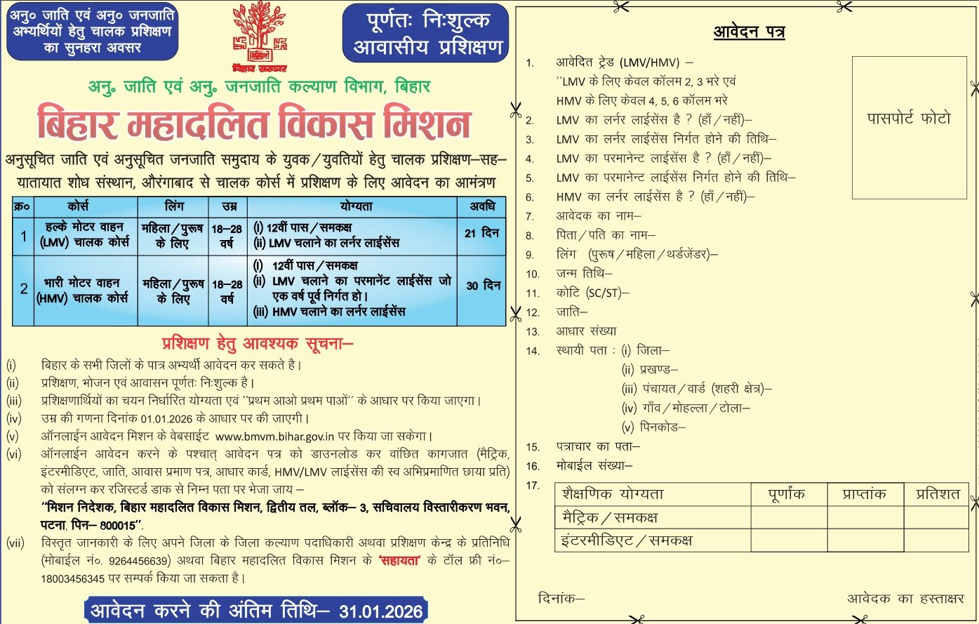 Bihar Free Driver Training Yojana 2026 में आवेदन करने की आखिरी तारीख 31 जनवरी 2026 हैं।