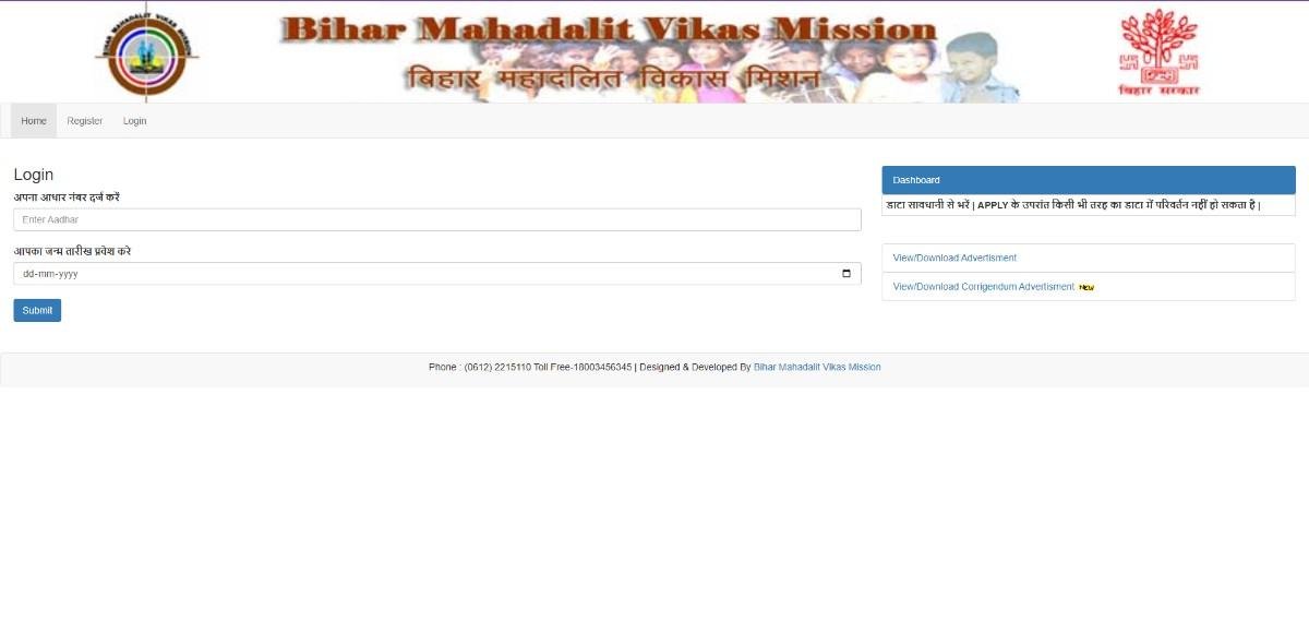 पता:- मिशन निदेशक, बिहार महादलित विकास मिशन, द्वितीय तल, ब्लॉक 3, सचिवालय विस्तारीकरण भवन, X पटना, पिन- 800015”