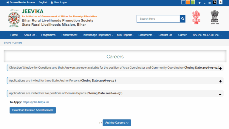 • होम पेज पर पहुंचने के बाद आपको Career के सेक्शन में जाकर Bihar Jeevika Result 2026 के लिंक पर क्लिक करना होगा।