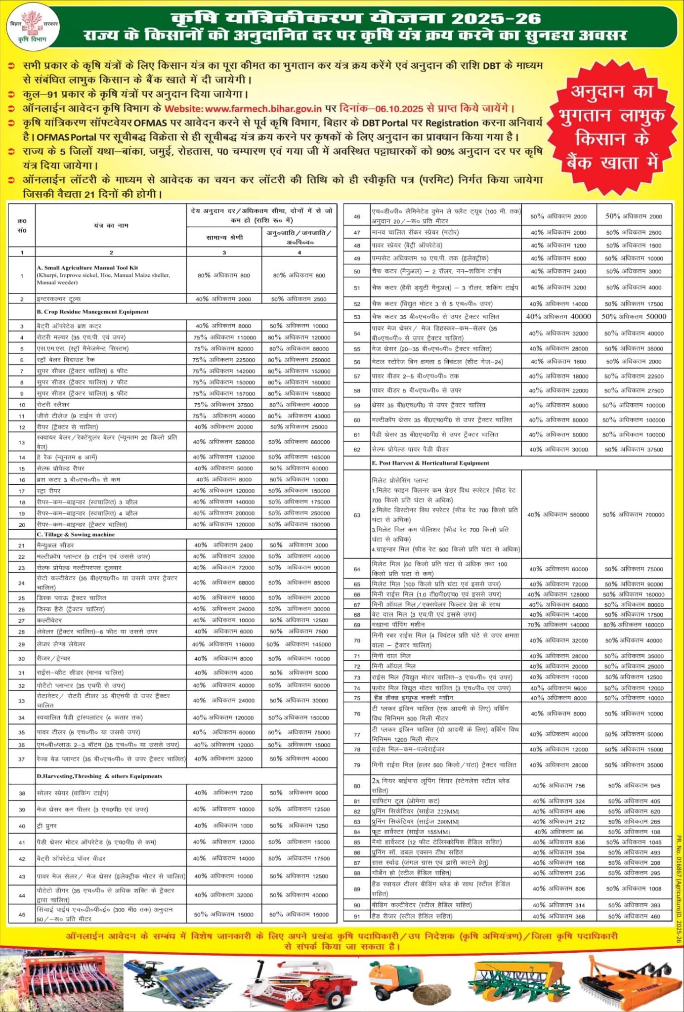 Bihar Krishi Yantrikaran Yojana 2025: बिहार सरकार द्वारा राज्य के किसानों के लिए बिहार कृषि यंत्रीकरण योजना को चलाया जा रहा है इस योजना के माध्यम से सरकार किसानों को 91 प्रकार के आधुनिक कृषि यंत्रों को खरीदने के लिए 40% से लेकर 90% तक की सब्सिडी प्रदान कर रही है और इस योजना में इच्छुक किसान 06 अक्टूबर 2025 से लेकर 31 अक्टूबर 2025 तक ऑनलाइन आवेदन कर सकते है।