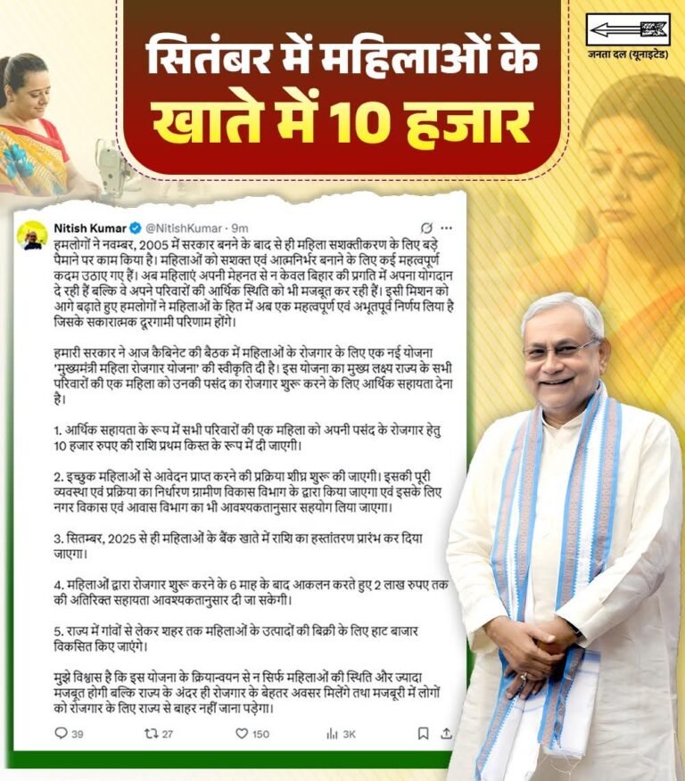 जैसा कि आप सभी जानती हैं कि अभी हाल ही में 26 सितंबर 2025 को बिहार सरकार द्वारा लगभग राज्य की 75 लाख महिलाओं के बैंक खाते में महिला रोजगार योजना की पहली 10 हजार रुपए की किस्त को डीबीटी के माध्यम से ट्रांसफर किया गया है जिससे कि महिलाएं अपना खुद का रोजगार शुरू करके आत्मनिर्भर बन सकें।
