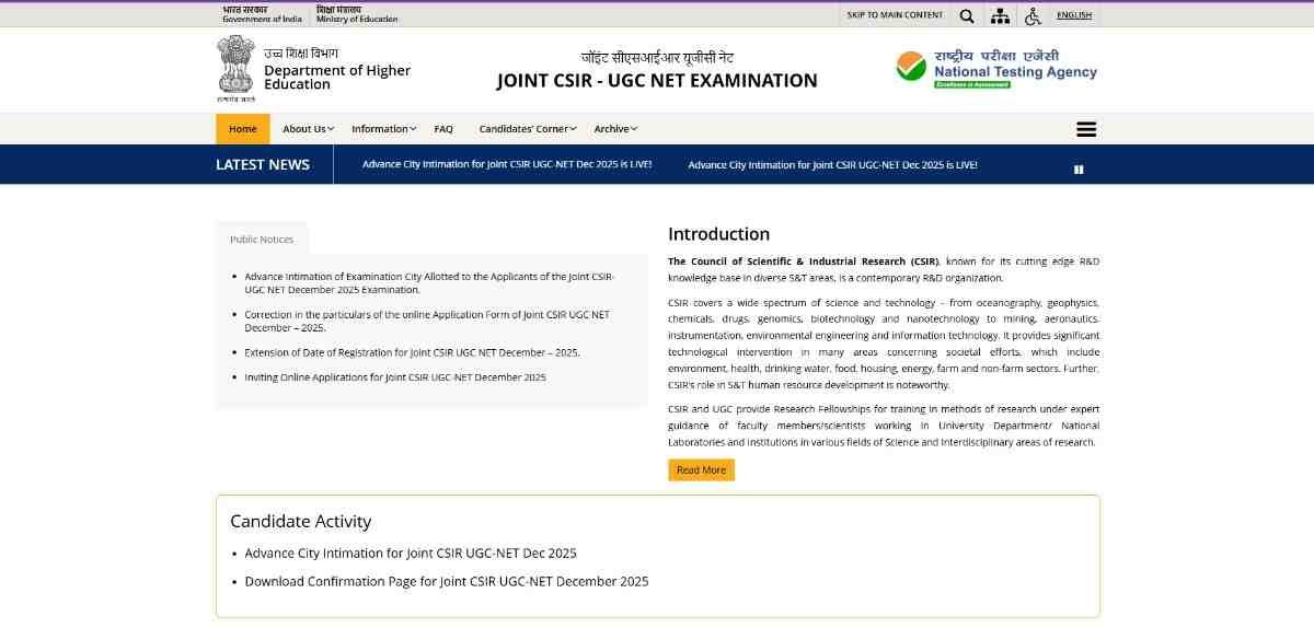 - होम पेज पर पहुंचने के बाद आपको Latest News के सेक्शन में दिए गए Joint CSIR UGC NET December 2025 Examination Admit Card के लिंक पर क्लिक करना होगा।