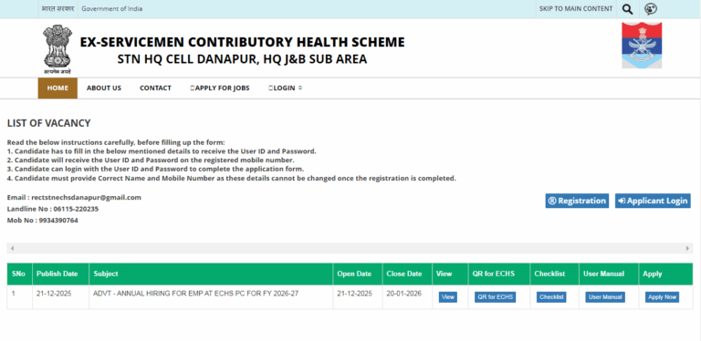 • होम पेज पर पहुंचने के बाद आपको ADVT – ANNUAL HIRING FOR EMP AT ECHS PC FOR FY 2026-27 के आगे दिए गए Apply Now के ऑप्शन पर क्लिक करना होगा।