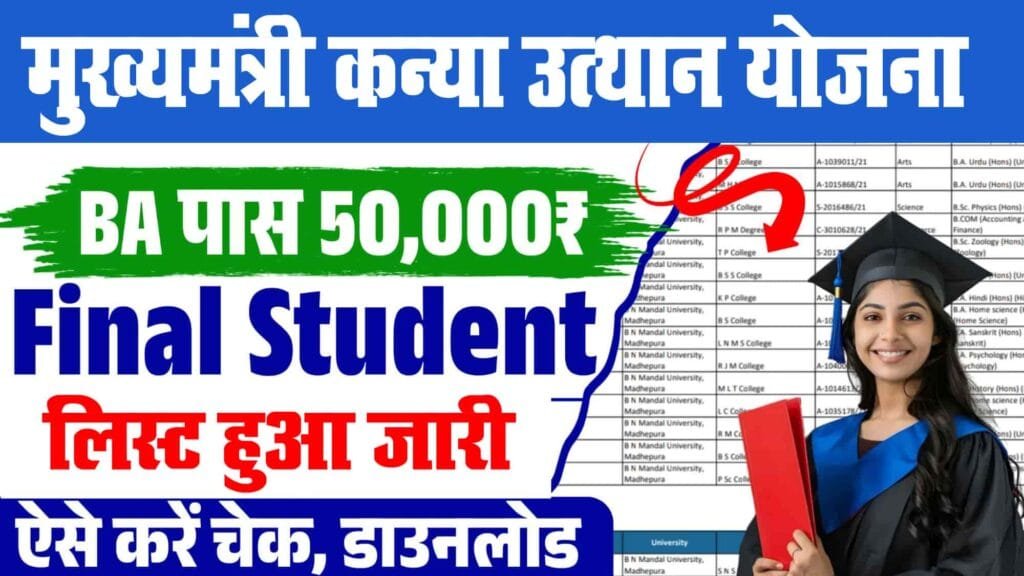 बिहार सरकार के उच्च शिक्षा विभाग ने मुख्यमंत्री कन्या उत्थान योजना के अंतर्गत स्नातक छात्राओं की अंतिम सूची जारी कर दी है। यह सूची उन्हीं छात्राओं के लिए बनाई गई है, जिन्होंने अपने विश्वविद्यालय के माध्यम से आवेदन किया था।