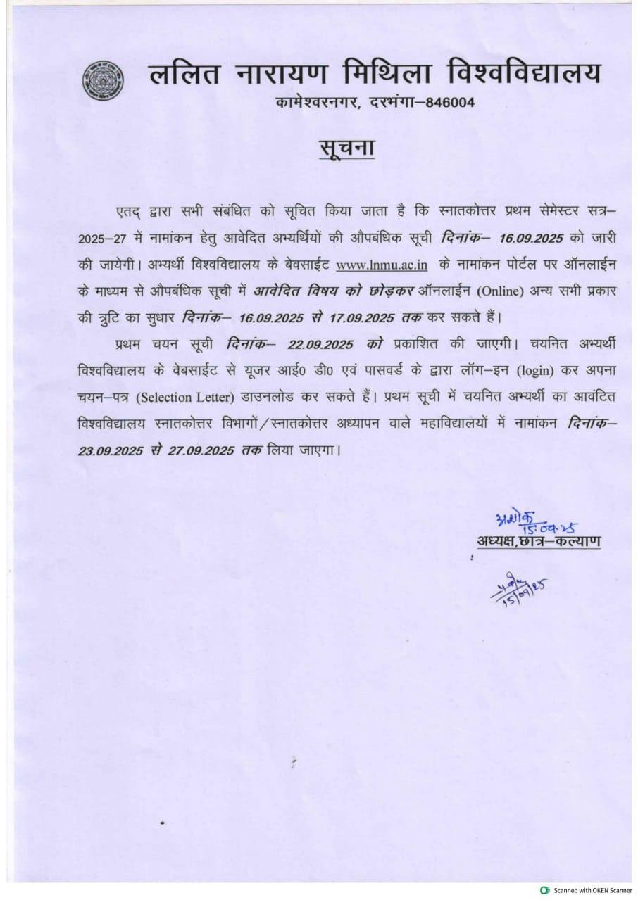 LNMU PG 1st Merit List 2025-27: क्या आप ललित नारायण मिथिला विश्वविद्यालय (LNMU), दरभंगा बिहार से स्नातकोत्तर (PG) की पढ़ाई करने के लिए ऑनलाइन आवेदन किया था और अब आप इसमें एडमिशन के लिए मेरिट लिस्ट के जारी होने का इंतजार कर रहे है, तो आपके लिए एक बहुत बड़ी खुशखबरी निकल कर आ रही है क्योंकि विश्वविद्यालय की ओर से इसकी पहली मेरिट लिस्ट को 22 सितंबर 2025 को प्रकाशित किया जा रहा है।