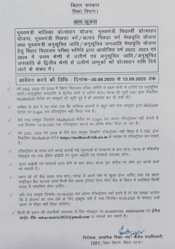 Matric-Inter Pass Scholarship 2022-2024: क्या आप बिहार राज्य से है और आपने बिहार बोर्ड से ही साल 2022, 2023, 2024 या 2025 कक्षा 10वीं या 12वीं पास की है लेकिन आपको अभी तक मैट्रिक-इंटर पास स्कॉलरशिप के 10 हजार रुपए से लेकर 25 हजार रुपए तक की स्कॉलरशिप नहीं मिली है, तो हम आपको बता दे कि बिहार सरकार द्वारा इस स्कॉलरशिप में ऑनलाइन आवेदन करने के लिए 30 अगस्त 2025 को पुनः पोर्टल ओपन कर दिया गया है आप इसमें 15 सितंबर 2025 तक ऑनलाइन आवेदन कर सकते है।