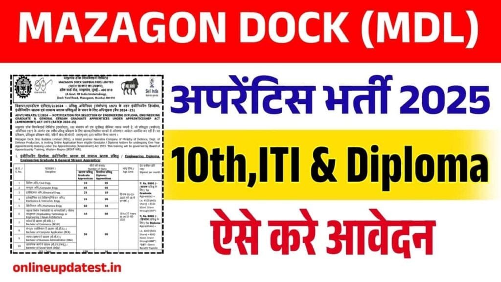 MAZAGON Dock Apprentice Vacancy 2025 : माझगांव डॉक शिपबिल्डर्स लिमिटेड (MDL), जो कि रक्षा मंत्रालय के अधीन एक प्रमुख नवरत्न कंपनी है, ने ग्रेजुएट अपरेंटिस, डिप्लोमा अपरेंटिस और सामान्य स्नातकों के लिए अप्रेंटिसशिप (संशोधन) अधिनियम 1973 के तहत भर्ती अधिसूचना जारी की है। यह भर्ती योग्य उम्मीदवारों को विभिन्न क्षेत्रों में एक वर्ष की अपरेंटिस ट्रेनिंग प्रदान करने का सुनहरा अवसर देती है।
