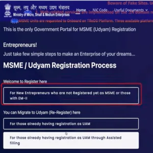 वेबसाइट के मुख्य पृष्ठ पर “नए उद्यमी के रूप में पंजीकरण करें” विकल्प पर क्लिक करें। यदि आपने पहले पंजीकरण नहीं किया है, तो “New Entrepreneur who is not Registered yet as MSME” विकल्प चुनें।
