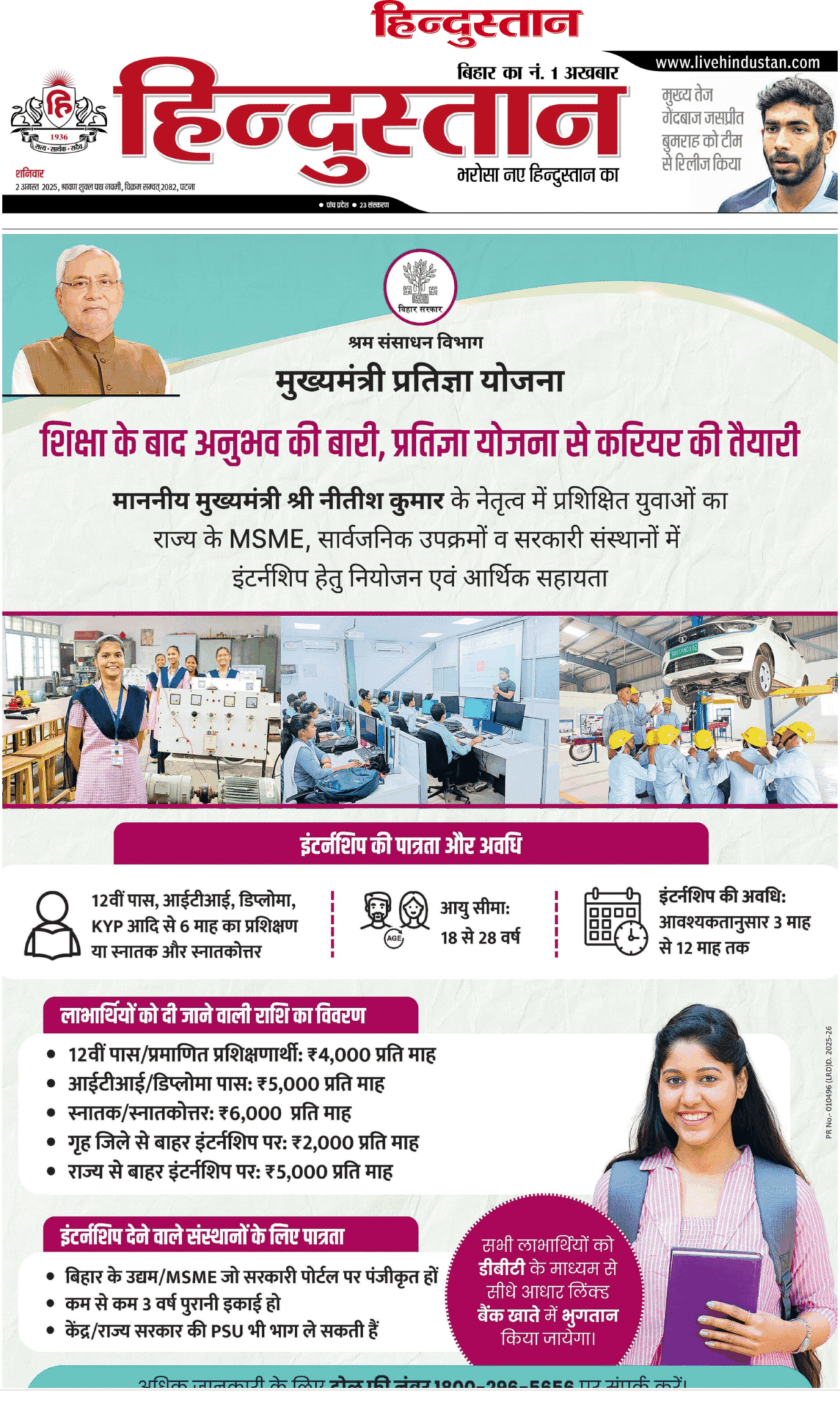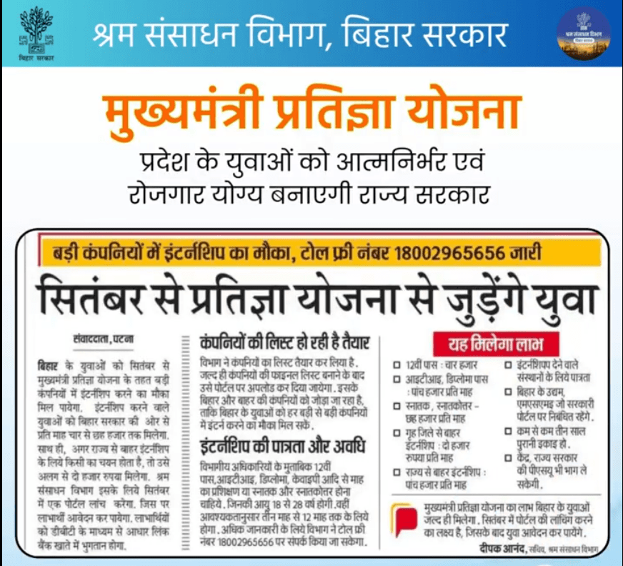 मुख्यमंत्री प्रतिज्ञा योजना की शुरूआत बिहार सरकार द्वारा की गई है इस योजना के माध्यम से सरकार युवाओं को 3 महीने से लेकर 12 महीने तक के फ्री इंटर्नशिप प्रदान करने वाली हैं और सरकार युवाओ को सरकार द्वारा इंटर्नशिप के दौरान 4 हजार रुपए से लेकर 6 हजार रुपए तक की आर्थिक सहायता राशि भी प्रदान की जाएगी इस योजना के माध्यम से सरकार युवाओं को आत्मनिर्भर बनाना चाहती है जिससे कि युवा अपने पैरों पर खड़े हो सके।