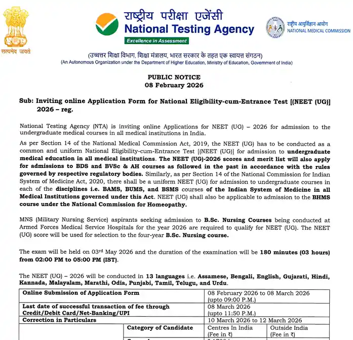NEET UG 2026: क्या आपने कक्षा 12वीं पास की है और आप MBBS, BDS या AYUSH जैसे मेडिकल कोर्स करना चाहते है, तो आपके लिए बहुत बड़ी खुशखबरी निकल कर आ रही है क्योंकि राष्ट्रीय परीक्षण एजेंसी (NTA) की ओर से NEET UG 2026 के लिए आधिकारिक अधिसूचना जारी कर दी गई है जिसमें कि उम्मीदवार 08 फरवरी 2026 से लेकर 08 मार्च 2026 तक ऑनलाइन आवेदन कर सकते है।