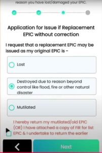 • क्लिक करने के बाद आपके समाने एक नया पेज ओपन हो जाएगा उस पेज में आपको Issue of Replacement EPIC without correction के विकल्प को सलेक्ट करके Next के ऑप्शन पर क्लिक कर देना होगा।