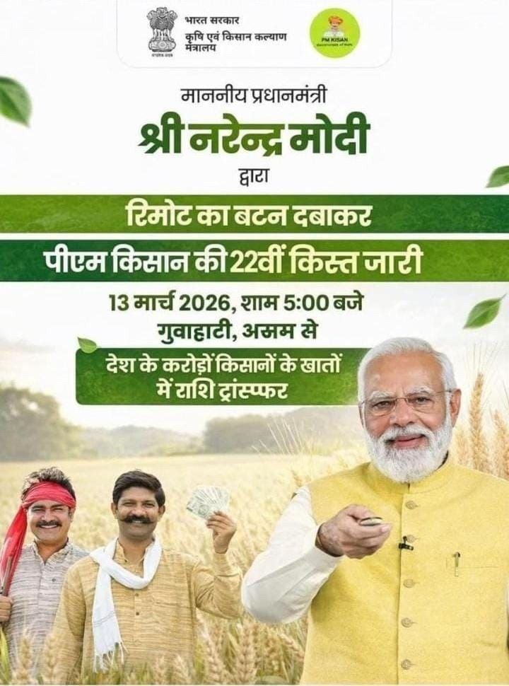 पीएम किसान सम्मान निधि योजना की 22वीं किस्त 13 मार्च 2026 को जारी होगी।
