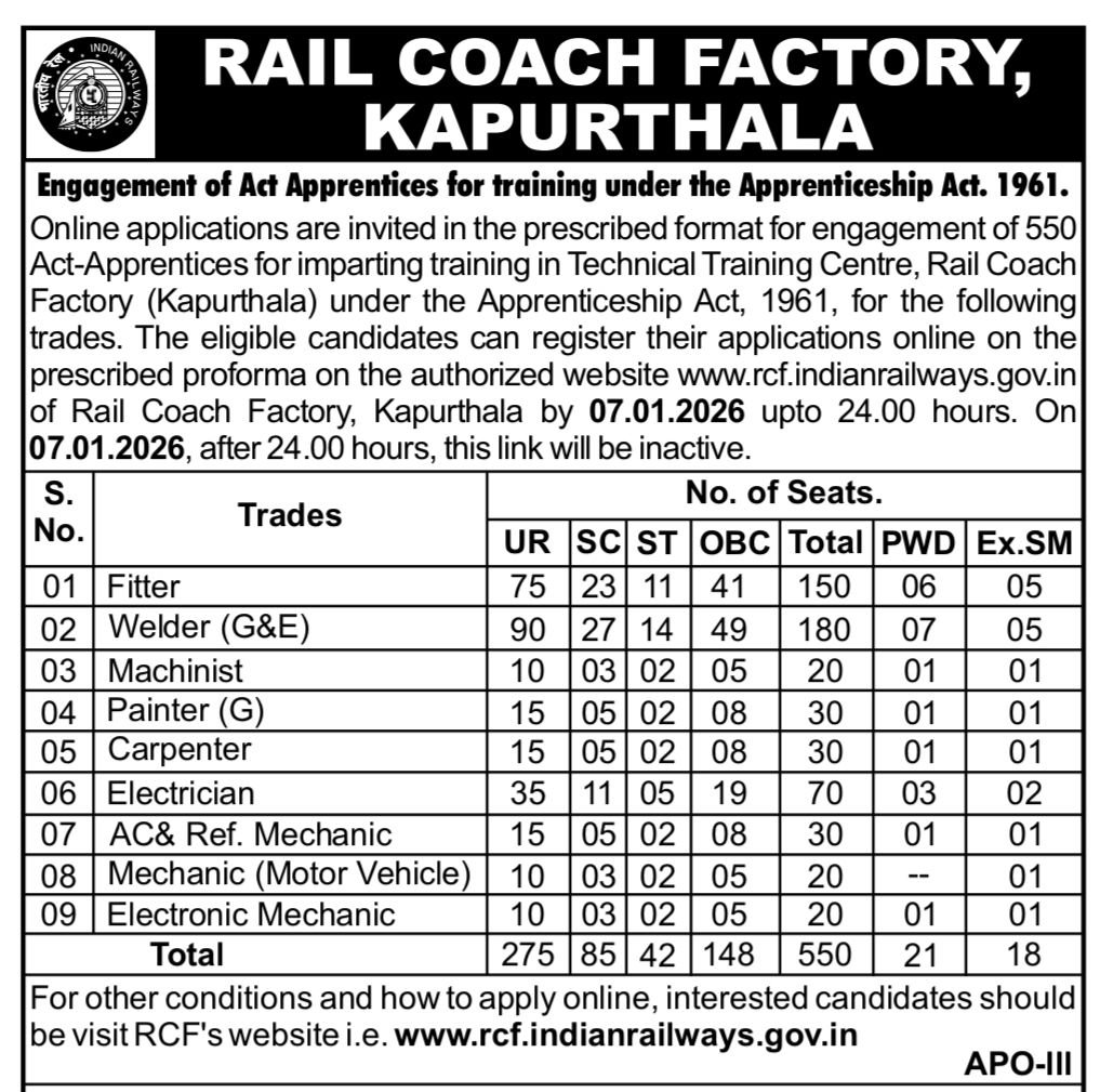 Rail Coach Factory Kapurthala Vacancy 2025 में ऑनलाइन आवेदन करने की आखिरी तारीख 07 जनवरी 2026 है।