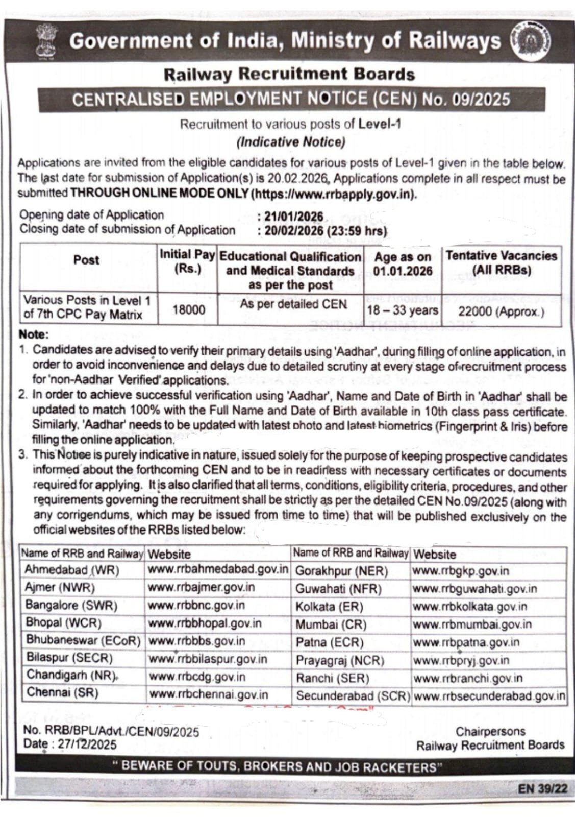 RRB Group D Vacancy 2026: क्या आप भारतीय रेलवे में ग्रुप डी के पद पर नौकरी प्राप्त करना चाहते है, तो आपके लिए एक बहुत बड़ी खुशखबरी निकल कर आ रही है क्योंकि रेलवे रिक्रूटमेंट बोर्ड (RRB) की ओर से ग्रुप डी के रिक्त 22,000 पदों पर भर्ती के लिए शॉर्ट नोटिस जारी कर दी गई है जिसमें कि उम्मीदवार 21 जनवरी 2026 से लेकर 20 फरवरी 2026 तक ऑनलाइन आवेदन कर पाएंगे।