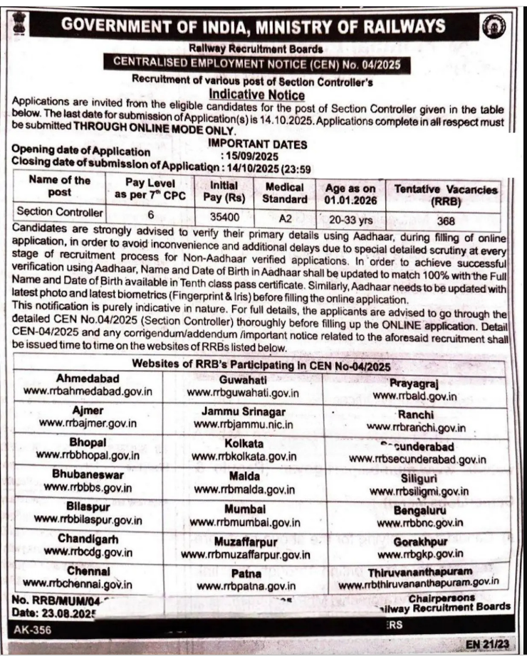 RRB Section Controller Vacancy 2025 : रेलवे भर्ती बोर्ड (RRB) ने CENTRALISED EMPLOYMENT NOTICE (CEN) NO. 04/2025 के तहत RRB Section Controller Vacancy 2025 की अधिसूचना जारी की है, जिसमें कुल 368 पदों पर भर्तियां की जाएंगी। इस भर्ती के लिए ऑनलाइन आवेदन 15 सितंबर 2025 से शुरू होंगे और 14 अक्टूबर 2025 तक चलेंगे। इस लेख में हम आपको RRB Section Controller Vacancy 2025 के बारे में विस्तार से जानकारी देंगे