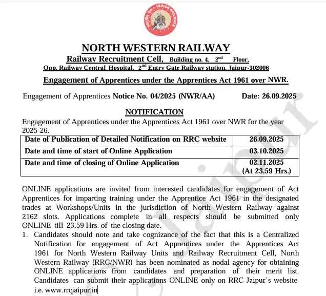 RRC NWR Apprentice Vacancy 2025 में आवेदन करने की आखिरी तारीख 02 नवंबर 2025 है।