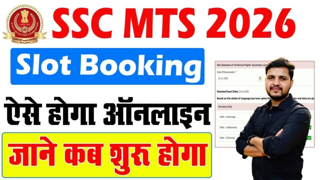 SSC MTS Self Slot Booking Kaise Kare: नमस्कार दोस्तों जैसा कि आप सभी जानते है कि कर्मचारी चयन आयोग (SSC) द्वारा मल्टी टास्किंग स्टाफ (MTS) के पदों पर भर्ती के लिए 04 फरवरी 2026 से आयोजित की जा रही परीक्षा के लिए सेल्फ स्लॉट बुकिंग की प्रक्रिया को 15 जनवरी 2026 को शुरू किया जाना था लेकिन किसीकरण अभी तक सेल्फ स्लॉट बुकिंग की प्रक्रिया को शुरू नहीं किया गया है, तो हम आपको बता दे कि आपको किसी भी प्रकार की कोई भी चिंता करने की आवश्यकता नहीं है क्योंकि अयोग द्वारा किसी भी समय सेल्फ स्लॉट बुकिंग की प्रक्रिया को शुरू किया जा सकता है।