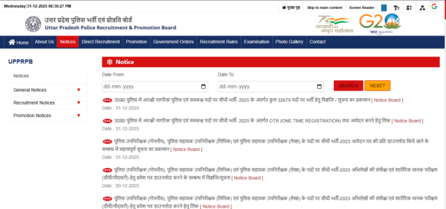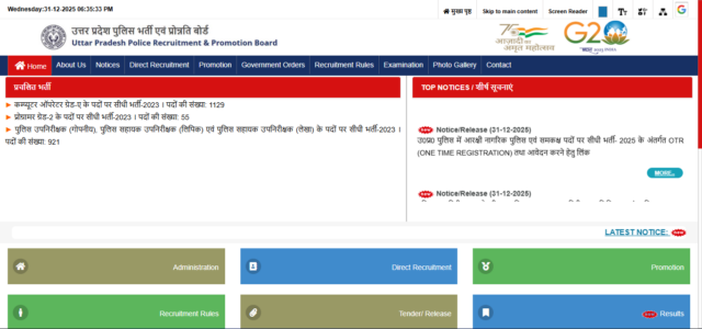 • होम पेज पर पहुंचने के बाद आपको Notifications / Advertisements या Recruitment के सेक्शन में जाकर UP Police Constable Recruitment 2026 से संबंधित आधिकारिक नोटिफिकेशन के लिंक पर क्लिक करना होगा।