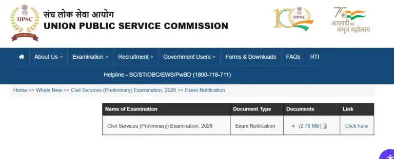 - होम पेज पर पहुंचने के बाद आपको Whats New सेक्शन में Exam Notification: Civil Services (Preliminary) Examination, 2026 के ऑप्शन पर क्लिक करना होगा।
