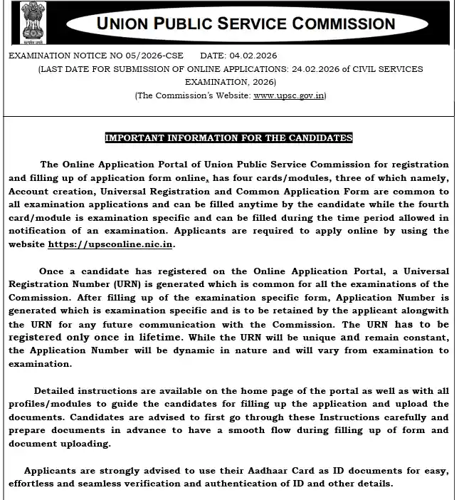UPSC CSE Vacancy 2026 के लिए ऑनलाइन आवेदन करने की आखिरी तारीख 24 फरवरी 2026 हैं।