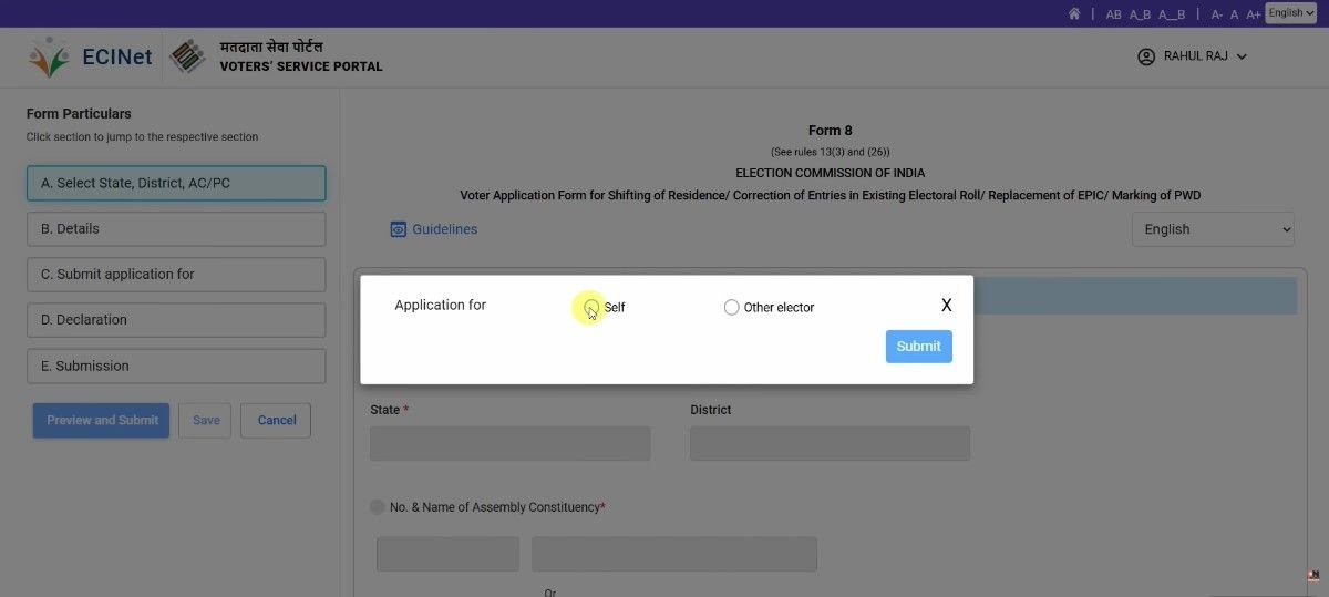 - लॉगिन करना के बाद आपके सामने एक नया पेज खुलकर आ जाएगा जिसमें कि आपको Self के ऑप्शन को सलेक्ट करने के बाद आपको अपने Epic Number को दर्ज करके Submit के ऑप्शन पर क्लिक कर देना होगा।